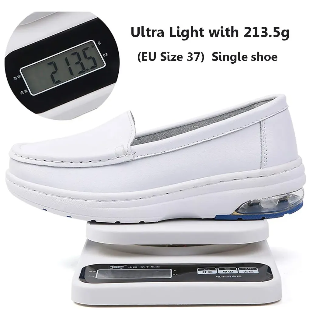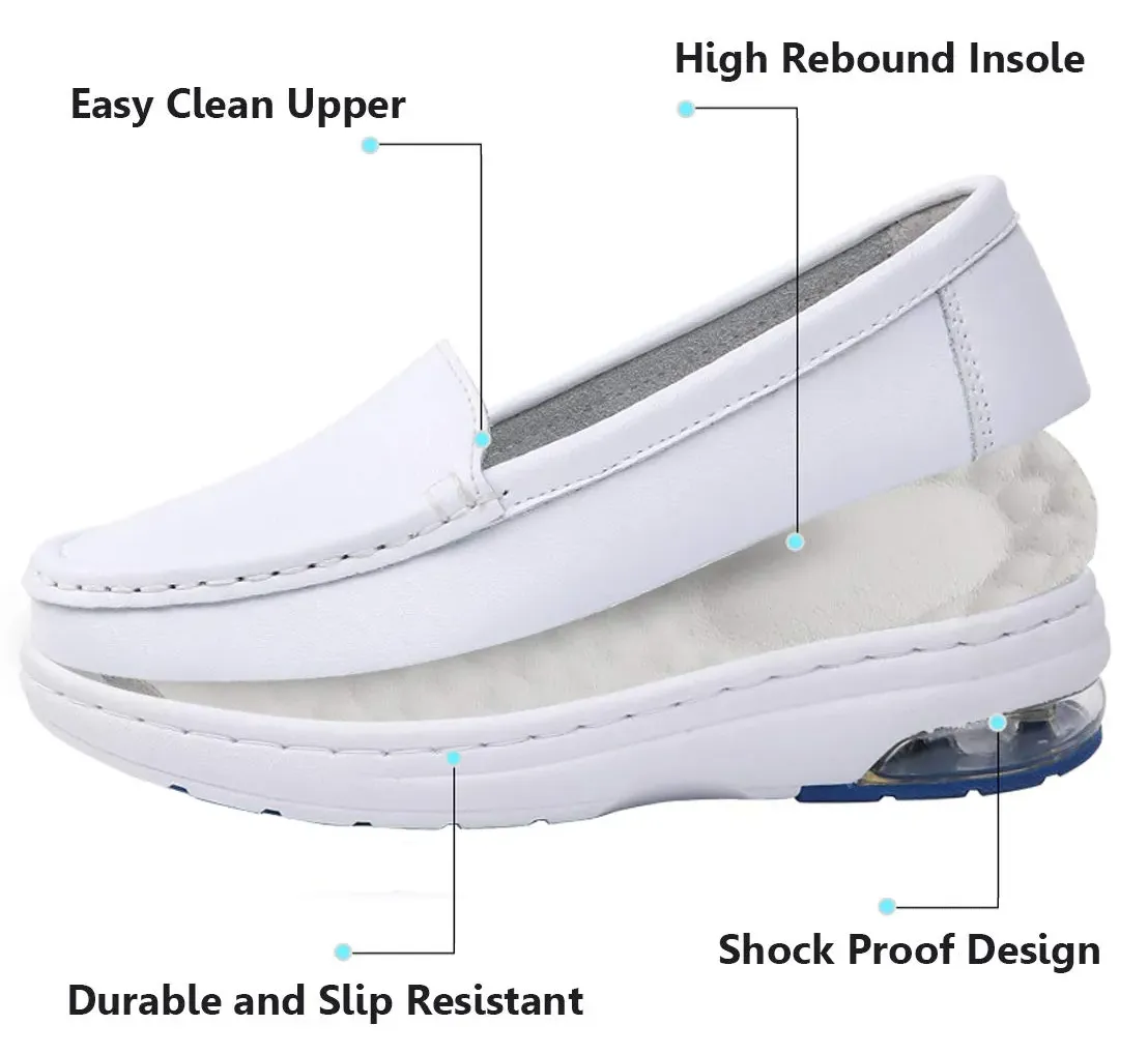These shoes are thoughtfully designed with healthcare professionals in mind, featuring a lightweight PU synthetic sole that provides excellent slip resistance for superior grip and stability while walking and standing. Made from leather, they are also very easy to clean—spills and stains, whether blood or urine, can be effortlessly wiped away with a damp cloth. For a more thorough clean, the shoes are fully machine washable, ensuring they remain free from bacteria and odors
